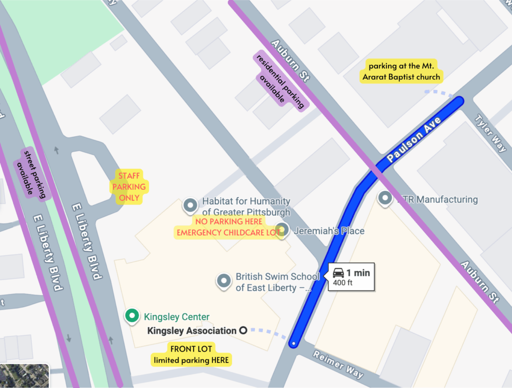 We have reserved the parking lot at Mt Ararat Baptist Church (on Paulson Ave). This is less than a 5 minute walk to Kingsley. This is FREE parking! Further residential parking can be found on Paulson Ave (both sides), East Liberty Blvd (left of Kingsley), Auburn St, and other side streets. Please do not park in the E Liberty Lot, just past Kingsley on the right, as it is private!